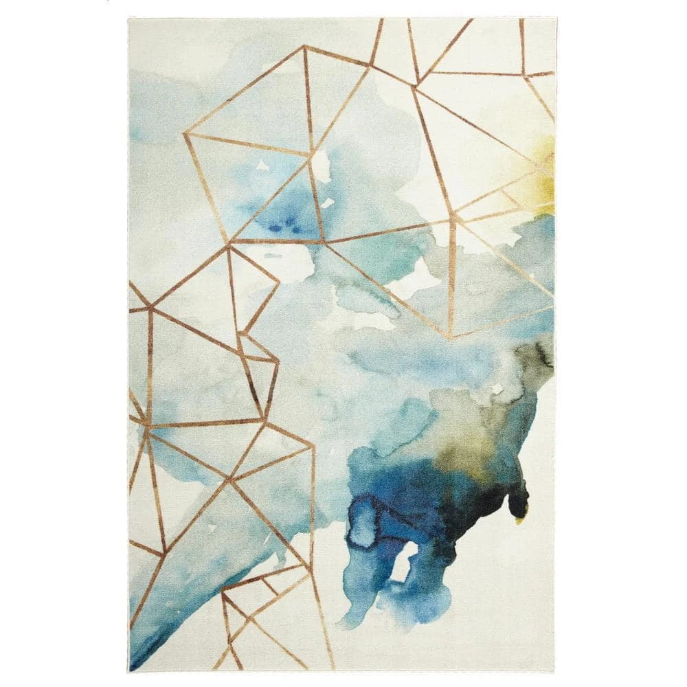 Painterly inspired splashes of blue, green and yellow color offer a modern accent to the golden abstract triangle motif of Mohawk Homes contemporary Cognition Water Area Rug. When it comes to color, the sky is no longer the limit with the infinite possibilities of Mohawk Homes revolutionary Prismatic Collection. Thoughtfully crafted in the U.S.A. in small batches utilizing Mohawk Homes exclusive Precision Dye Injected Printer, the Prismatic Collection is redefining printed rugs, literally one original design at a time. Each style in this collection features superior strength, stain resistance, and a cozy soft touch. Consciously created with Everstrand yarn, Mohawk Homes exclusive premium recycled polyester produced from post-consumer plastic water bottles, this collection offers environmentally friendly options that are as easy on the eyes as they are the world around us. With a 100% polyester design, it is an extremely durable option for your home.