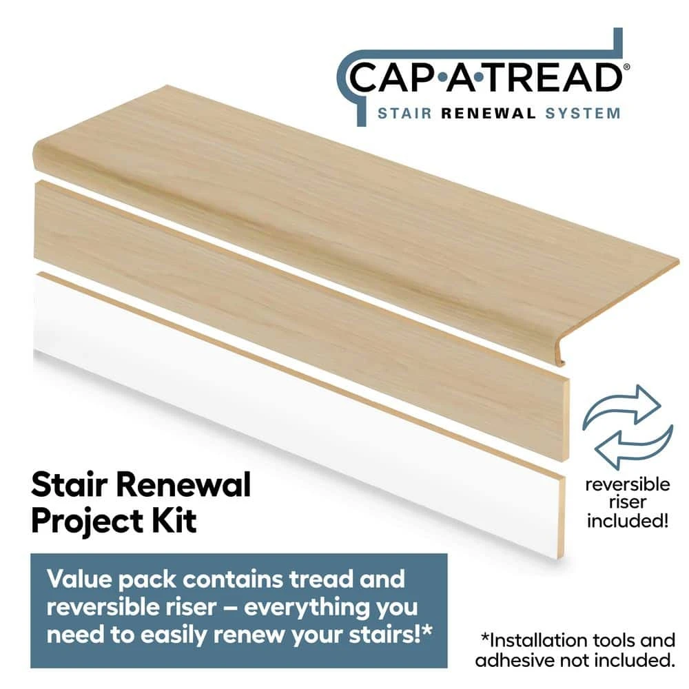 - New; stair renewal project kit – value pack contains tread and reversible riser – everything you need to easily renew your stairs; kit includes 1 tread and 1 reversible riser; choose to install for white or matching color riser look; installation tools and adhesive not included
