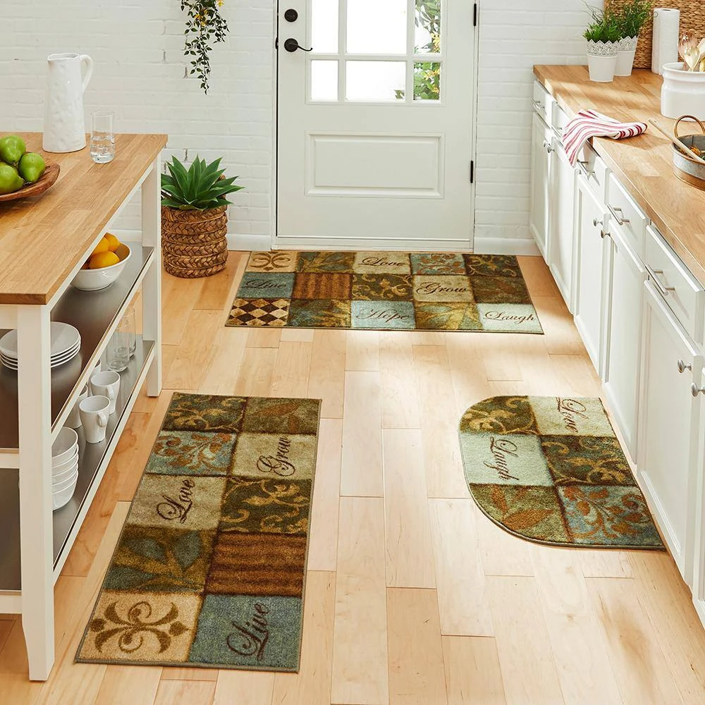 Sophisticated shades of neutral earth tones like grey, tan, green, gold, brown and black beautifully balance the timeless tile motif of Mohawk Homes Les Fleurs La Terre Multi Accent Rug Set. The silky soft styles of this three-piece set are available in size 20×45, 30×50 and 20×30 slice, making it easy to create a coordinated look perfect for any kitchen. Flawlessly finished with advanced technology, this style features brilliant color clarity and richly defined details. The cozy cut pile base is created with a premium synthetic yarn that provides proven stain resistance power and reliable resistance to daily wear-and-tear. Durably designed to be kid and pet friendly, this area rug is suitable for high traffic areas. Keep your new rug and the flooring beneath looking their best with an essential all-surface, earth conscious rug pad, crafted of 100% recycled fibers and certified Green Label Plus by The Carpet & Rug Institute!